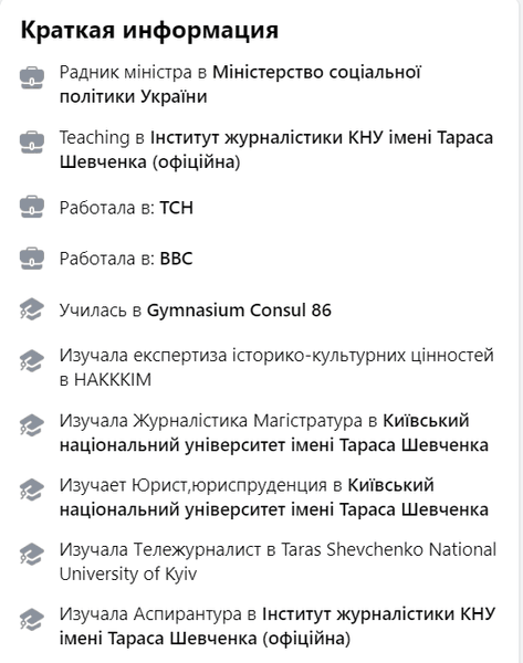 У себе на сторінці у Facebook Сергєєва зазначила, що працювала у ТСН (з 9 травня 2017 по 31 грудня 2018 року) та ВВС (з 1 лютого 2014 по 31 грудня 2015 року), але не вказала, на якій посаді.