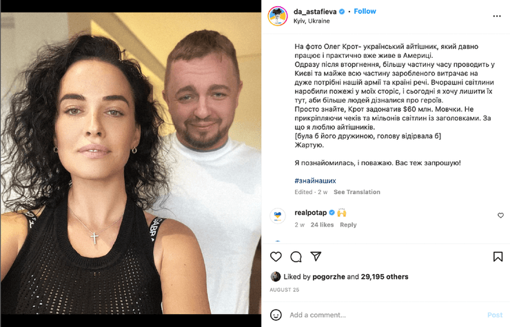 Ба більше — "Течію" підтримують навіть публічні особи. Так, відома українська співачка Даша Астафʼєва публікувала в своєму інстаграм фото з Олегом Кротом, де захоплювалася його щедрістю.