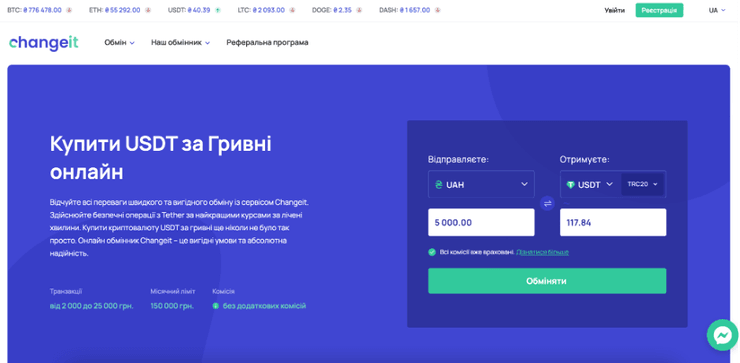 Розглянемо інструкцію придбання цифрових активів на сайті Changeit на прикладі USDT. Все що вам потрібно зробити — це зайти на сайт і розпочати обмін, оскільки реєстрація на платформі не обов'язкова.