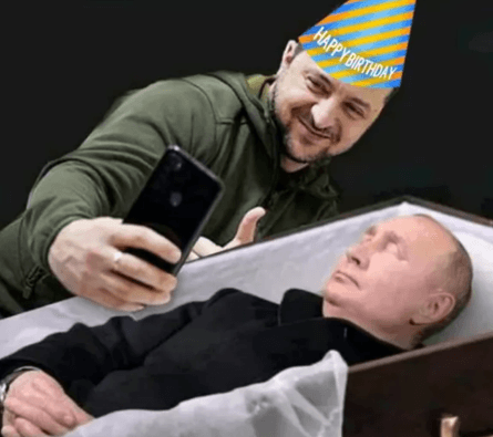 Користувачі вигадали оригінальні торти на святковий стіл Володимира Путіна — у формі чорних пакетів для російської армії, триколору та екскрементів. На одному з мемів Путін готується скуштувати ласощі з 70 тисяч тіл російських солдатів.
