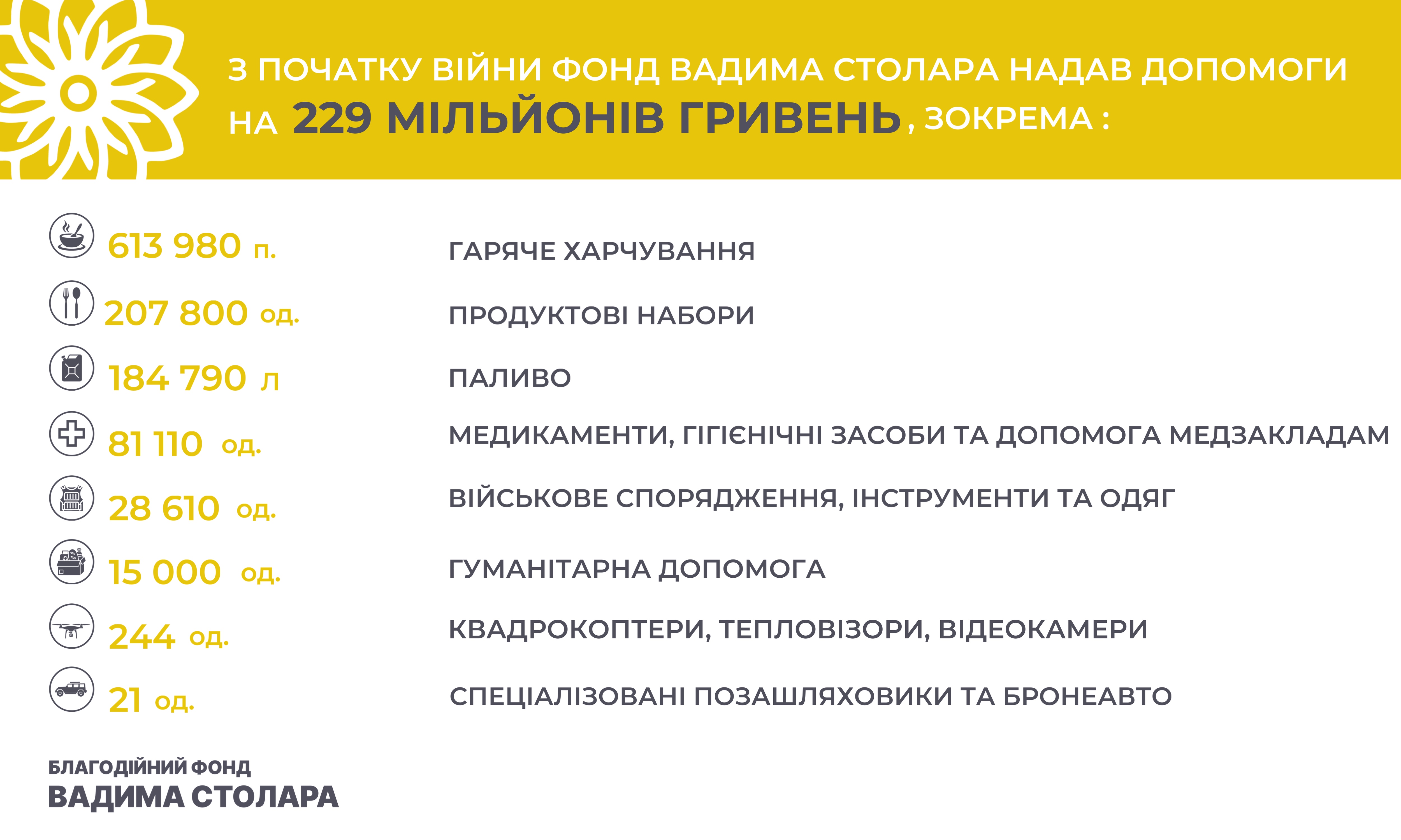 Загалом з початку повномасштабної російської агресії Фондом Вадима Столара разом із засновником було надано допомоги на 229 млн грн.