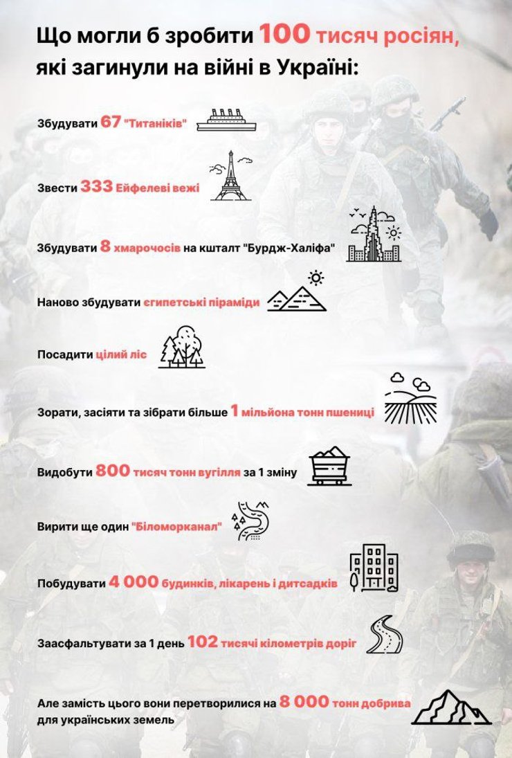 За інформацією, яку надає Генштаб Збройних сил України, станом на 22 грудня Російська Федерація втратила після повномасштабного вторгнення в Україну вже 100 тисяч осіб. З кожним днем до цього числа додаються сотні росіян. Аби краще осягнути, наскільки це не мале число, слід уявити, що було б, якщо всі ці ліквідовані не пішли на війну в Україну, а залишилися на батьківщині й розбудовували її.