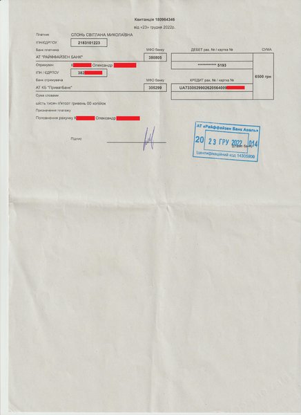 Платіжні квитанції, надані банком, свідчать, що гроші пішли якомусь Олександру К.