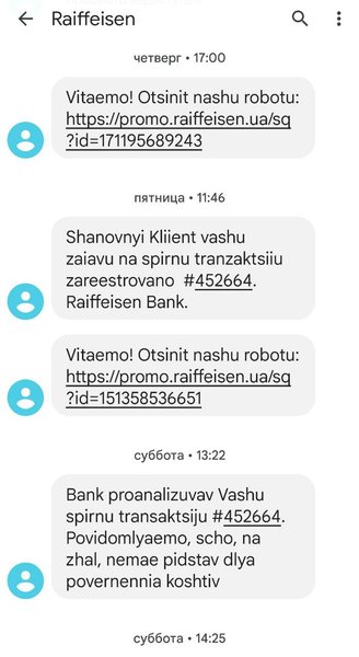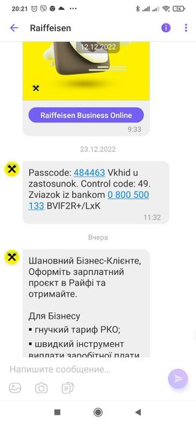 Спочатку Світлана викладала вимоги до листування з Viber-ботом "Райффайзен Банку". Спірну транзакцію зареєстрували під номером 452664. Пароль на вхід до додатка відправили 23 грудня об 11:32 після переказу 125 тисяч гривень з рахунку.