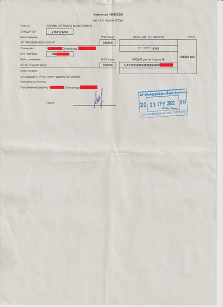 Світлана Слонь розповіла Фокусу, що 23 грудня поповнила картку через термінал на 131,5 тисяч гривень у єдиному відділенні "Райффайзен Банку" в місті Первомайський Харківської області. За кілька хвилин після зарахування грошей їх переказали на рахунок чоловіка 2004 року народження, який є клієнтом "Приватбанку".