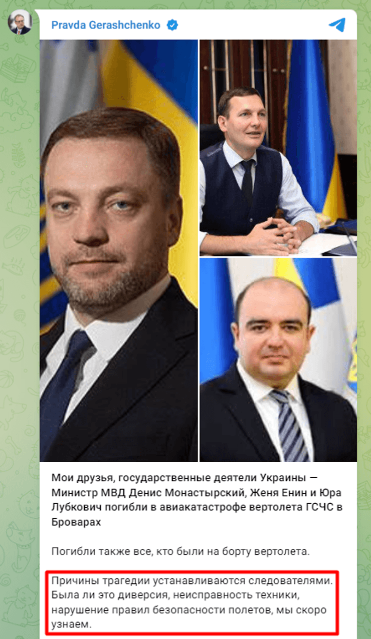 Унаслідок аварії вертольота в Броварах вранці 18 січня загинули міністр внутрішніх справ Денис Монастирський, перший заступник голови МВС Євген Єнін та державний секретар відомства Юрій Лубкович, які перебували на борту літального апарату.