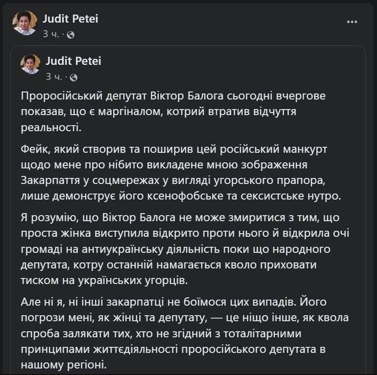 Того ж дня на звинувачення відреагувала Юдіта Петеї. Вона стверджувала, що цей пост є фейком, який створив та поширив "російський манкурт" Віктор Балога. За її словами, це відповідь їй за те, що вона "розплющила очі громадськості на антиукраїнську діяльність поки народного депутата". На момент публікації новини пост на сторінці Петеї видалили. Проте залишився скриншот.