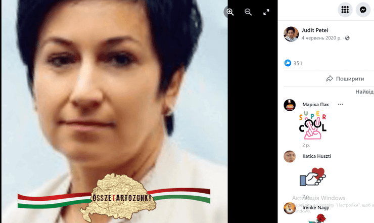 Зазначимо, що на сторінці Юдіти Петеї була також публікація 2020 року із зображенням карти "Великої Угорщини", куди входило Закарпаття, із написом "Ми належимо один одному". Однак на момент написання матеріалу її видалено.