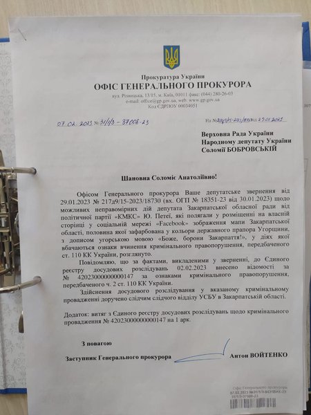 Офіс генерального прокурора розпочав кримінальне провадження щодо депутатки Закарпатської обласної ради від Партії угорців України (KMKSZ) Юдіти Петеї, яка опублікувала на своїй сторінці у Facebook зображення Закарпаття з угорським прапором. Про це повідомила народна депутатка від партії "Голос" Соломія Бобровська.