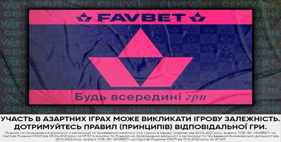 Ліцензія на провадження діяльності з організації та проведення азартних ігор казино в мережі Інтернет від 20.04.2021 року, видана ТОВ "БК "ФАВБЕТ" на підставі Рішення КРАІЛ від 05.04.2021 року за №137 із змінами та Ліцензія на провадження діяльності з організації та проведення букмекерської діяльності від 28.12.2022 року, видана ТОВ "БК "ФАВБЕТ" на підставі Рішення КРАІЛ від 13.12.2022 року за № 433