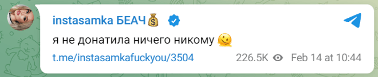 У своєму телеграм-каналі Інстасамка заперечила чутки щодо переказу коштів на ЗС РФ.