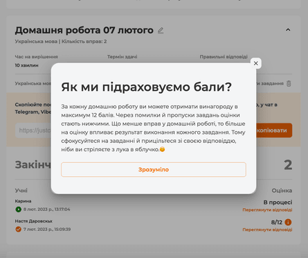 Також в умовах війни, зауважує Світлана Ройз, "коли ми проживаємо складний досвід, стрес, травматизацію — змінюється самооцінка, зараз часто діти живуть у режимі очікування невдачі. Їм потрібен досвід і підтримка. Маленькі знайомі завдання, завдання, де був би швидкий результат". І завдяки тому, що на платформі JustClass учні відразу бачать свої оцінки, щойно вони здають завдання вчителю, діти отримують швидкі результати та їм більше не тривожаться через це, допоки вчитель перевірить їхні домашні роботи.