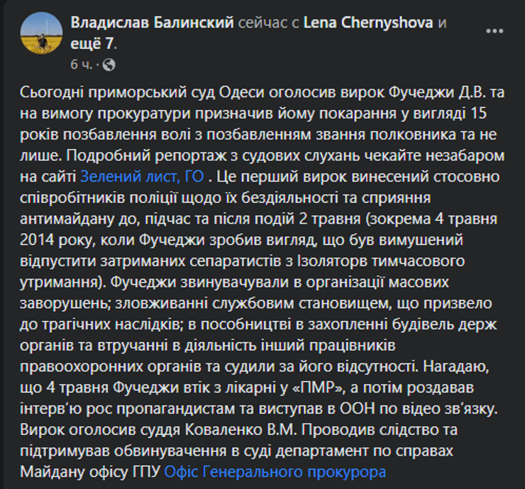 За його словами, це перший вирок, винесений стосовно правоохоронців щодо їх бездіяльності та сприяння антимайдану до, під час та після подій 2 травня (зокрема 4 травня 2014 року, коли Фучеджі вдав, що був змушений відпустити затриманих сепаратистів з ізоляторів тимчасового утримання).