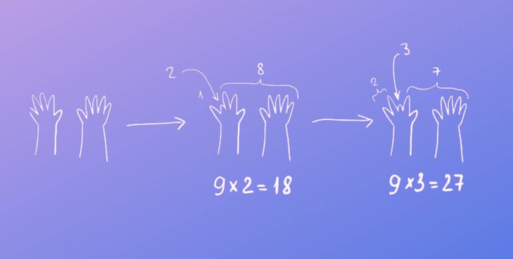 Почніть із розчепірювання всіх 10 пальців перед собою. Щоб обчислити 9×1, опустіть лівий мізинець. Що залишилося? 9 пальців! Для 9×2 опустіть лівий безіменний палець. Що тепер залишилося? 1 палець і пробіл, за яким йдуть 8 пальців — це 18. Такий спосіб працює до 9×9 (8 і 1 або 81). Але навчаючи таким трюкам, не забувайте запитувати дітей, чому вони працюють, і які математичні розрахунки стоять за ними.