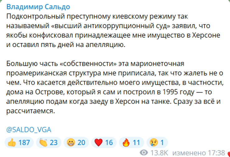 Більшість власності, як зазначив Сальдо, йому "приписали". Колаборант визнав, що володіє будинком на Острові, який сам збудував у 1995 році. ВАКС залишив Сальдо п'ять днів на подання апеляції.
