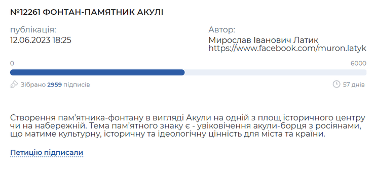 "Тема пам'ятного знака є — увіковічення акули-борця з росіянами, що матиме культурну, історичну й ідеологічну цінність для міста й країни", — зазначив він.