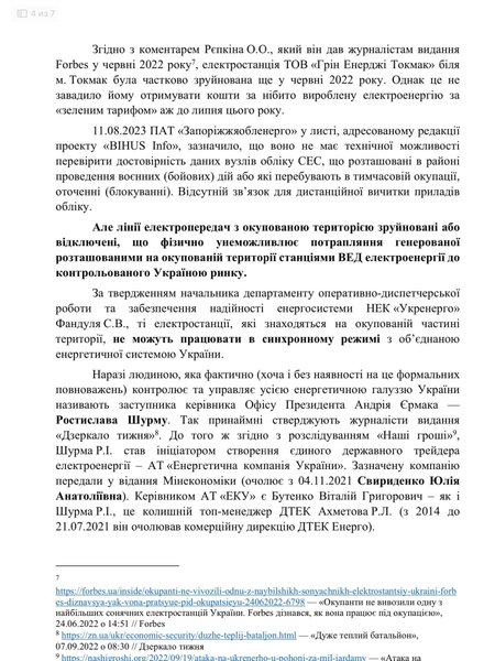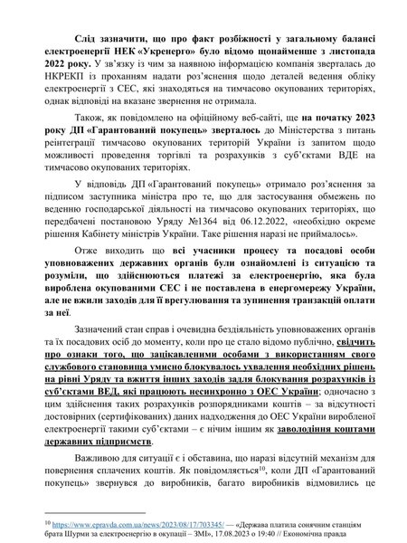 "Отже виходить, що всі учасники процесу та посадові особи уповноважених держорганів були ознайомлені із ситуацією та розуміли, що здійснюються платежі за е/е, яка була вироблена окупованими СЕС і не поставлена в енергомережу України, але не вжили заходів для її врегулювання та зупинення транзакцій оплати за неї. Зазначений стан справ і очевидна бездіяльність уповноважених органів та їх посадових осіб до моменту, коли про це стало відомо публічно, свідчить про ознаки того, що зацікавленими особами з використанням свого службового становища умисно блокувалось ухвалення необхідних рішень на рівні уряду та вжиття інших заходів задля блокування розрахунків із суб’єктами ВЕД, які працюють несинхронно з ОЕС України; одночасно з цим здійснення таких розрахунків розпорядниками коштів – за відсутності достовірних (сертифікованих) даних надходження до ОЕС України, виробленої електроенергії такими суб’єктами, – є нічим іншим як заволодіння коштами держпідприємств", — заявив він.