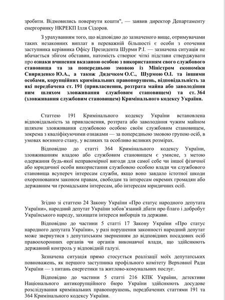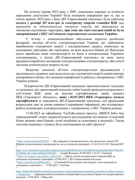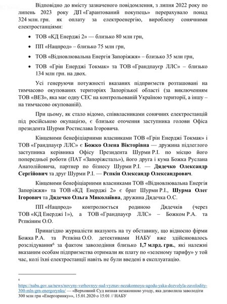 "Мені як народному депутату стали відомі факти і обставини, що переконливо свідчать про ознаки вчинення корупційних кримінальних правопорушень проти народу України, а саме розкрадання сотень мільйонів гривень державних коштів в умовах воєнного стану. На початку серпня 2023 року у ЗМІ, соціальних мережах та особисто народними депутатами України, була поширена інформація про те, що за січень-травень 2023 року з боку ДП "Гарантований покупець" була здійснена оплата у розмірі 367 млн грн за електричну енергію станціям ВДЕ (що працюють на відновлювальних джерелах енергії), які знаходяться на тимчасово окупованих територіях, при тому що такі електростанції не були синхронізовані з ОЕС (об’єднаною енергетичною системою) України", — говориться в тексті депутатського запиту на ім'я директора НАБУ Семена Кривоноса.
