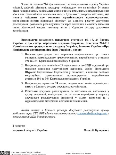 Перший заступник голови парламентського комітету з питань паливно-енергетичного комплексу, нардеп Олексій Кучеренко офіційно звернувся до НАБУ з вимогою розслідувати можливу злочинну діяльність заступника голови Офісу президента Ростислава Шурмі і його оточення, передає "Телеграф".