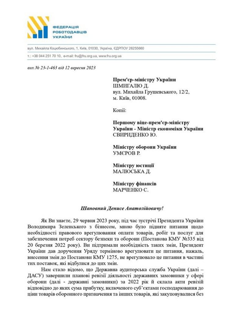 ФРУ називає його незаконним, оскільки це рішення безпосередньо суперечить Закону "Про оборонні закупівлі", у якому чітко захищене право на прибуток для компаній-постачальників товарів для армії.