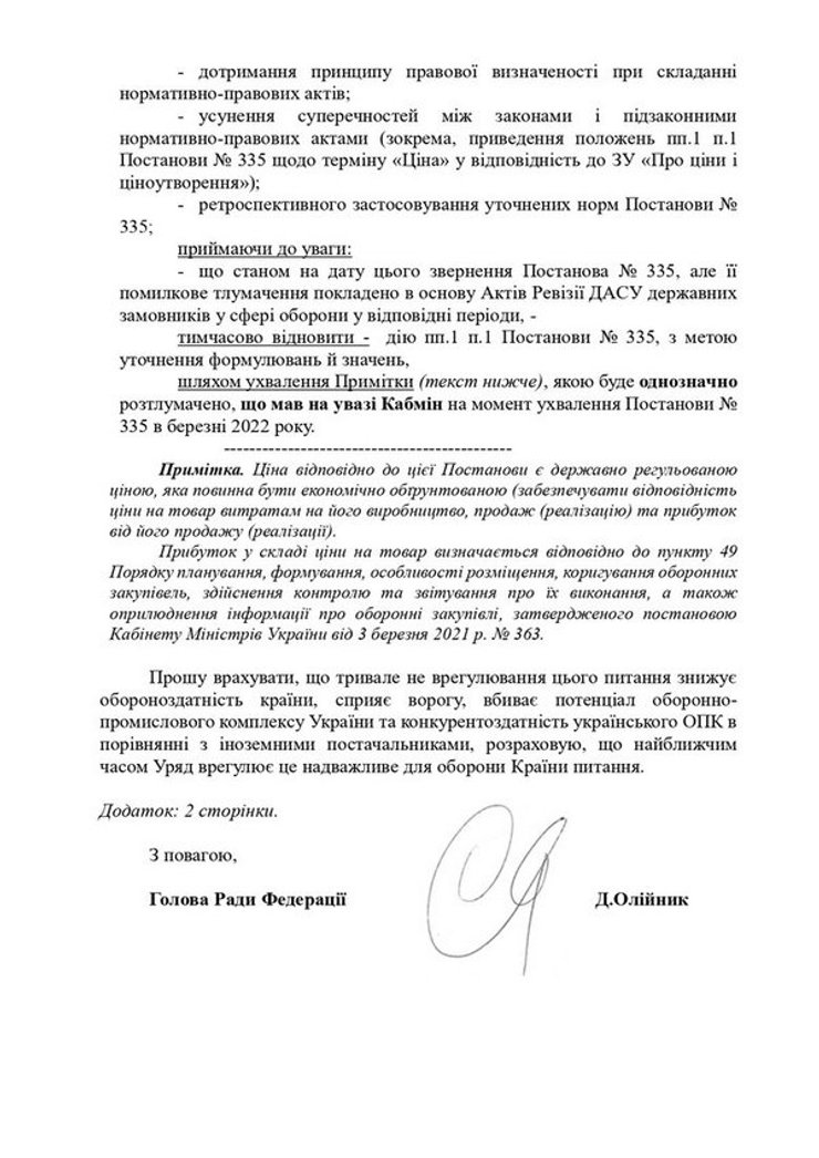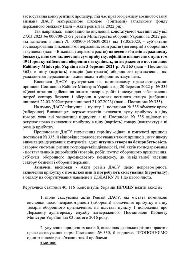 У листі главу уряду закликають скасувати акти ревізій ДАСУ, які "мають помилкові висновки про неправомірність (заборону) включення прибутку в ціну товарів оборонного призначення".