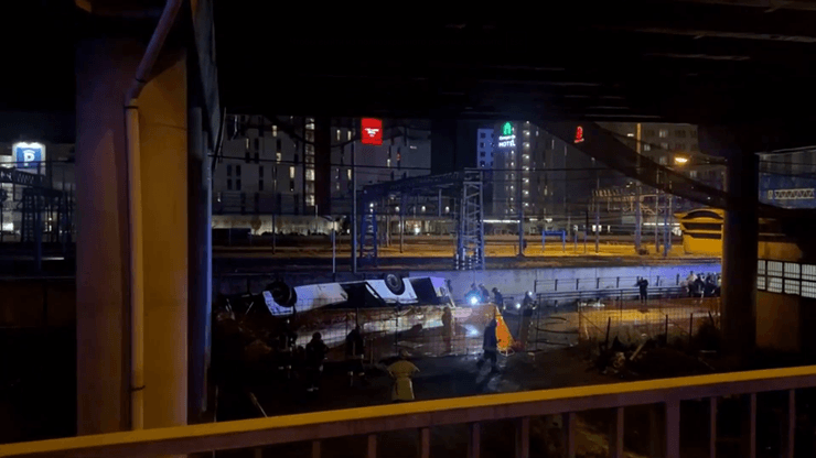 На опублікованих в мережі кадрах видно, що автобус на невеликій швидкості їде естакадою, а далі повертає праворуч і падає вниз на залізничні колії.