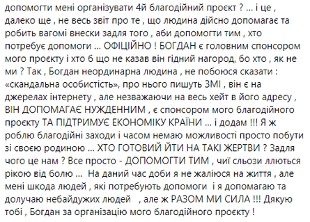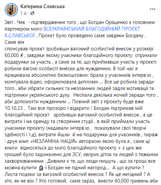 "Саме він спонсорував проєкт, зробивши вагомий особистий внесок у розмірі 60 000 гривень, завдяки якому учасники благодійного проєкту отримали подарунки за участь, а саме за те, що, беручи участь у проєкті, робили вагомі особисті внески для тих, хто цього потребує. На той час я працювала абсолютно безоплатно: брала в учасників інтерв'ю, монтувала відео, оформлювала дипломи... Усе це робила заради того, щоб зібрати сильних і незламних людей для мотивації та підтримки українського духу. Не спала кілька ночей заради того, щоб допомогти нужденним... Повний звіт за проєктом буде вже 10.10.23. Там усе прозоро і відкрито!" — написала Славська.