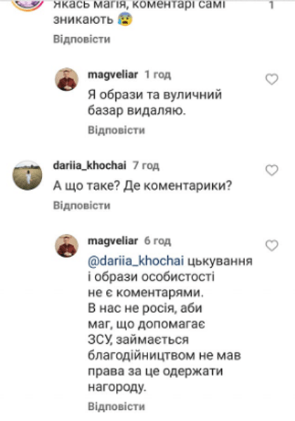 "Хочу висунути зневагу і ганьбу на адресу всіх тих, хто принижує магів і відьом України, занижуючи нашу роль у боротьбі з російською навалою, нехтуючи нашим подвигом з перших днів війни, коли ми не сиділи на диванах, а пішли й захищали країну інформаційно, публічно, допомагаючи людям, воїнам ЗСУ, волонтерством, а головне — ритуалами на смерть росіян, "кадирівців" (подивіться зараз на Кадирова), на перемогу України. Ганьба, сором і лють!" — написав Орищенко.