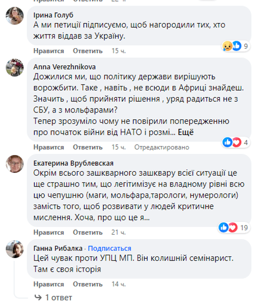 "Крім усього зашквару всієї ситуації це ще страшно тим, що легітимізує на владному рівні всю цю нісенітницю (маги, мольфари, тарологи, нумерологи) замість того, щоб розвивати в людей критичне мислення", — написала одна з користувачок мережі.