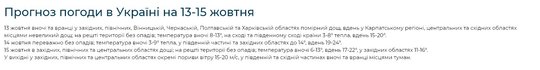 ВажливоУ дописі вказано, що слід очікувати похолодання, починаючи з 15-16 жовтня 2023 року. Однак у п'ятницю 13 жовтня буде ще порівняно тепло. Зокрема, на більшості території України температура повітря становитиме +14+18 градусів Цельсія. На півдні та заході буде тепліше — +16+22 градуси.