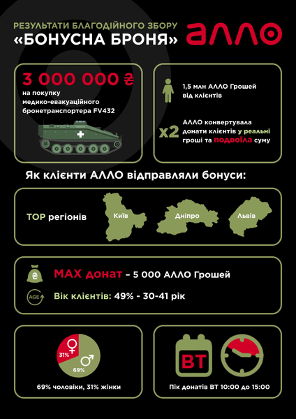 Незвичайний збір "Бонусна Броня" за участю АЛЛО та інших відповідальних ритейлерів поставив за мету придбати гусеничні бронетранспортери типу FV-432 та броньовані позашляховики Snatch Land Rover. Цей медичний броньований транспорт допоможе зберегти життя українських захисників, які кровʼю і потом виборюють кожен сантиметр нашої землі. У проєкті "Бонусна Броня" взяли участь українські компанії АЛЛО, EVA, WOG, ARGO, "Фора", "Сільпо", "Антошка", "Аптека Подорожник", Hotline. Загальна зібрана сума склала 14 630 220 грн.