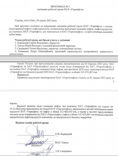 "У березні 2023 року між "Укрнафтою" та "Укртатнафтою", керівниками яких є Корецький, було укладено угоду про врегулювання правовідносин щодо повернення переробленої нафти, за умовами якої "Укртатнафта" визнала, що впродовж 2022 року отримувала від "Укрнафти" неоформлену нафту. Також сторони погодили, що в рахунок відшкодування вартості цієї нафти "Укртатнафта" віддає "Укрнафті" вироблені з неї нафтопродукти, саме ті близько 100 тис. тонн", — пише Михайло Шнайдер, яким чином "Укрнафта" отримала контроль над ресурсом, що їй взагалі-то не належав.