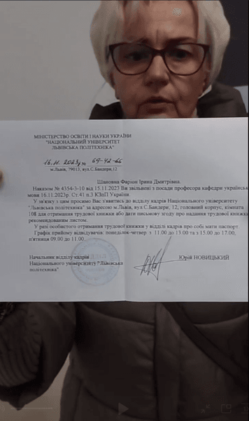 Фаріон отримала витяг з наказу про звільнення | Фото: Скрин відео