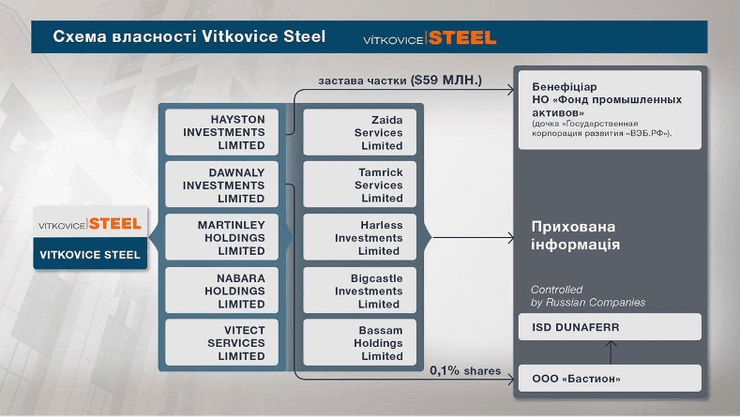 За даними ЗМІ, до 2014 року Vitkovice Steel належала компанії Evraz путінського олігарха Романа Абрамовича, який перебуває під західними санкціями. Після російського вторгнення у Крим, він змінив структуру власності компанії, сховавши свою частку за групою приватних інвесторів у кіпрських офшорах Martinley Holdings Limited, Nabara Holdings Limited, Vitect Services Limited, Hayston Investments Limited і Dawnaly Investments Limited. Ця кіпрська п’ятірка добре відома в Росії, як пов’язана з проектами російського державного інвестиційного банку ВЕБ.РФ. Банк знаходиться під санкціями, але його приховані у складних структурах власності компанії продовжують працювати й впливати на економічну ситуацію у європейських країнах.