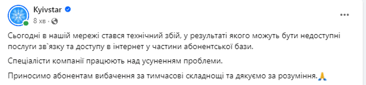 На сторінці Kyivstar в Facebook повідомили, що у мережі стався технічний збій. Відтак деякі послуги зв’язку та доступ в інтернет можуть бути недоступними у частини абонентів. Наразі мобільний оператор працює над усуненням проблеми.