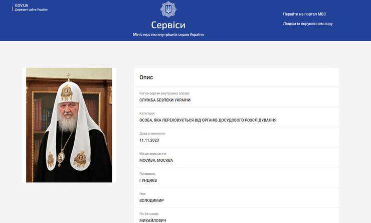 Настоятеля Російської Православної Церкви Патріарха Кирила оголосили в розшук. Про це вказано в інформаційній картці, яку опублікували на сайті реєстру МВС України.