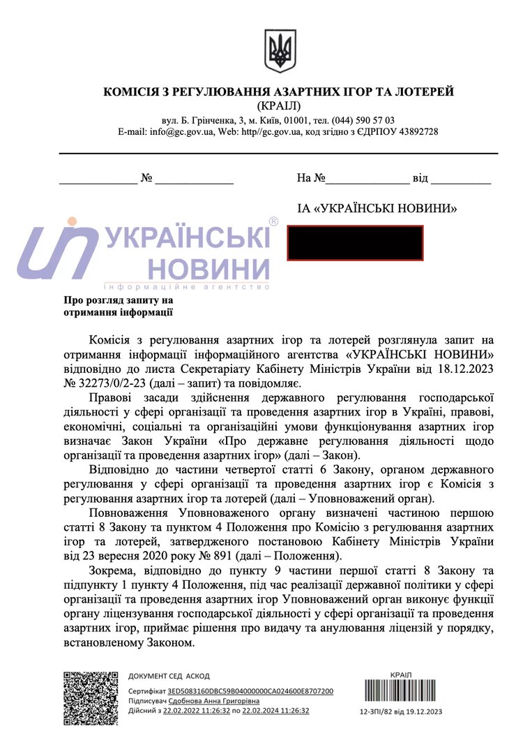 Комісія з регулювання азартних ігор та лотерей не підтвердила інформацію про наявність контролю росіянами діяльності ТОВ "Укр гейм технолоджі" (бренд PIN-UP), повідомляє КРАІЛ у відповідь на запит "Українських Новин".
