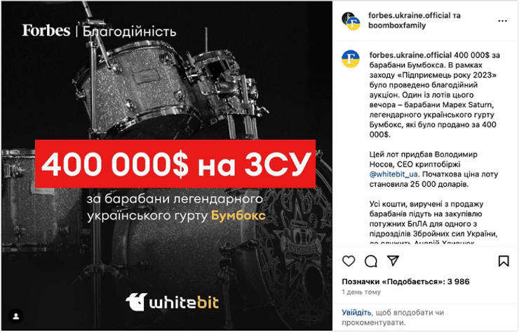 Барабани Mapex Saturn відомого українського гурту "Бумбокс" були продані на благодійному аукціоні за 400 тисяч доларів. Новим власником став Володимир Носов, засновник і CEO WhiteBIT. Усі кошти від продажу будуть спрямовані на купівлю БпЛА для підрозділу Андрія Хливнюка. Подія відбулася в межах щорічної премії Forbes Ukraine "Підприємець року 2023".