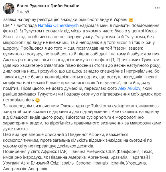 Заявка на першу реєстрацію знахідки рідкісного виду Tulostoma cyclophorum, як розповів Євген Руденко, в Україні вже подана.