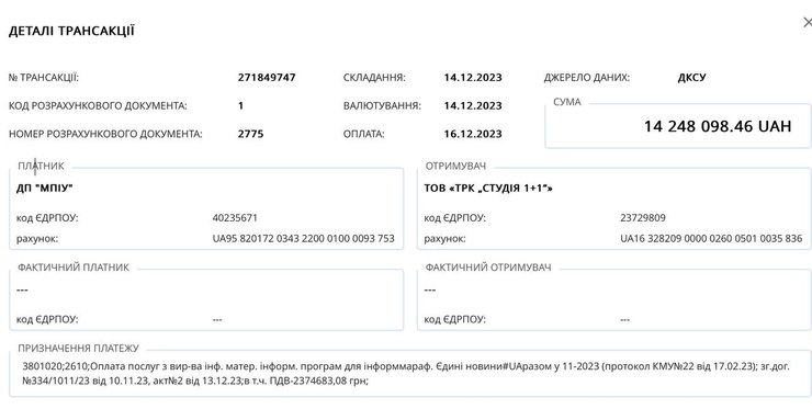 Так, лише одному телеканалу, а саме ТОВ "ТРК "Студія 1+1" у грудні було сплачено 14,2 мільйона гривень. За словами нардепа, за цей рік тільки цьому телеканалу загалом було перераховано 116,1 мільйона гривень.