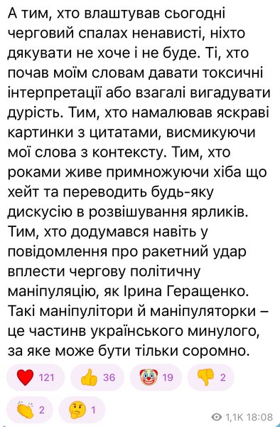 "Ті, хто почав моїм словам давати токсичні інтерпретації або взагалі вигадувати дурість. Тим, хто намалював яскраві картинки з цитатами, висмикуючи мої слова з контексту. Тим, хто роками живе, примножуючи хіба що хейт, і переводить будь-яку дискусію в розвішування ярликів", — каже Лещенко.