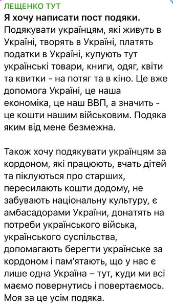 У дописі, який Лещенко оприлюднив у вівторок, 22 січня, він вирішив подякувати українцям, "які живуть, творять і платять податки в Україні".