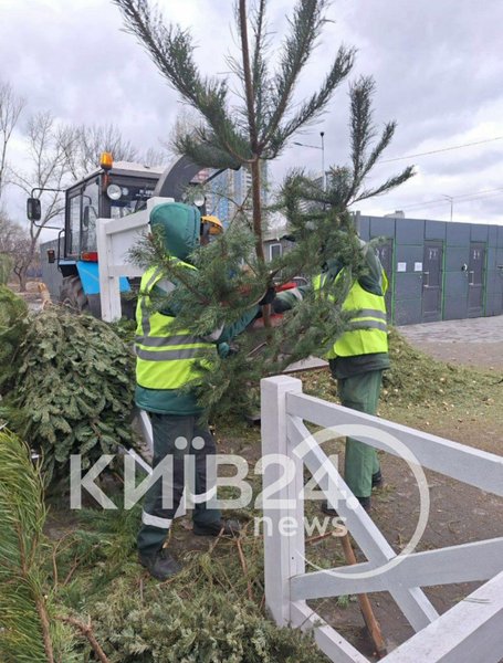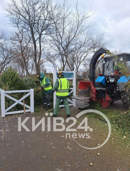 Ялинки та сосни, які принесли на утилізацію, комунальники за допомогою спеціального обладнання переробляють на щепу, яку потім використають для благоустрою столичних парків і скверів.
