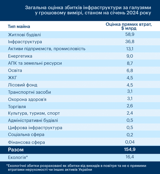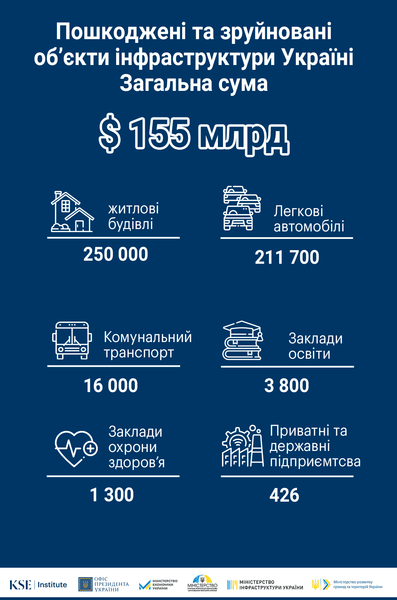 Оновила оцінку збитків, завданих інфраструктурі України, і Київська школа економіки. За підрахунками KSE Institute, станом на січень 2024 року ця сума складає 155 мільярдів доларів.