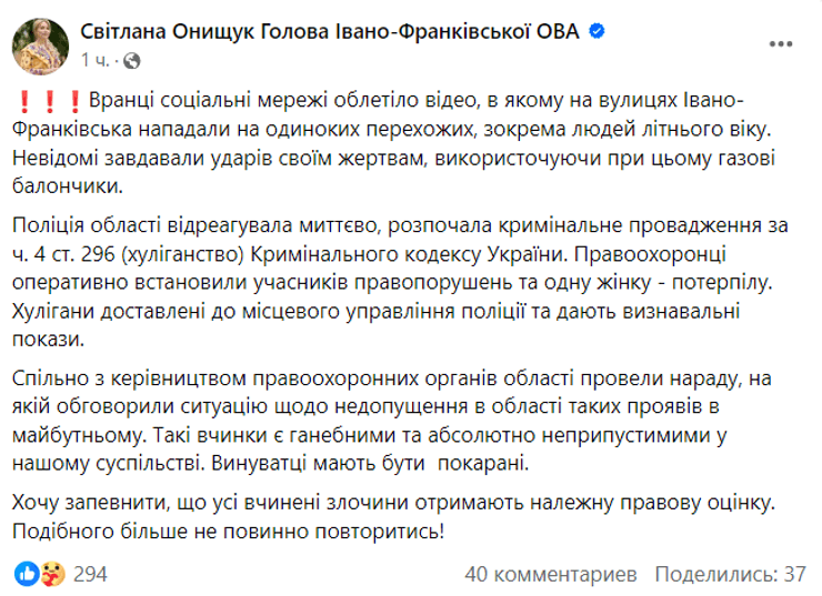 У неділю, 3 березня, соцмережі облетіло відео, зняте в Івано-Франківську, де підлітки нападають на самотніх перехожих і б'ють їх. Під їхні кулаки і ноги та газові балончики потрапили навіть літні люди. На ці кадри відреагувала голова Івано-Франківської ОВА Світлана Онищук.