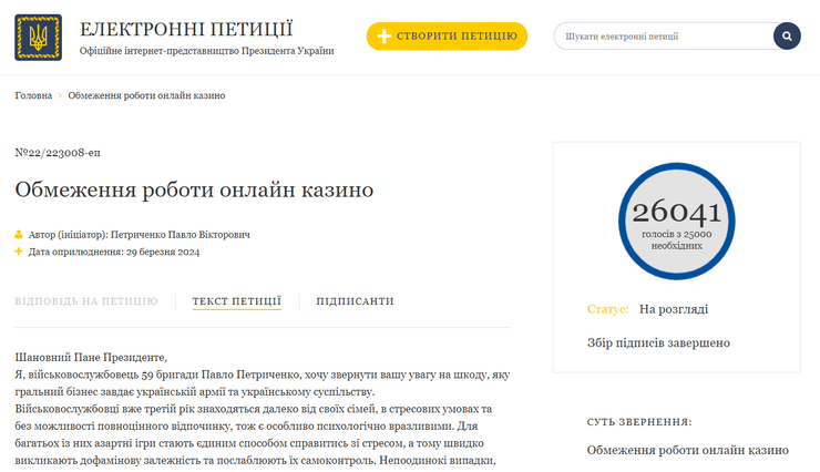 Також у вечірньому зверненні Зеленський відреагував на петицію щодо обмеження роботи онлайн-казино, яка була зареєстрована 29 березня на сайті президента. Менше ніж за пів дня вона зібрала понад 26 тисяч підписів українців з 25 тисяч необхідних для розгляду. Петицію зареєстрував військовослужбовець 59 бригади Павло Петриченко.
