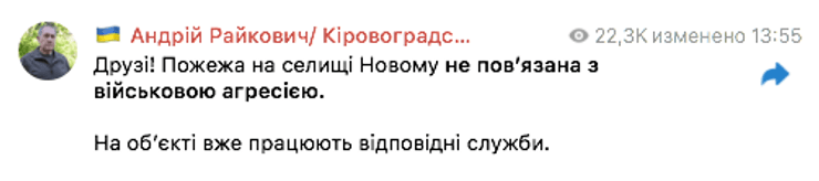 У передмісті обласного центру Кіровоградської області, селищі Новому, 6 травня на одному з підприємств сталася пожежа. Про це повідомив очільник Кіровоградської ОВА Андрій Райкович у власному телеграм-каналі.