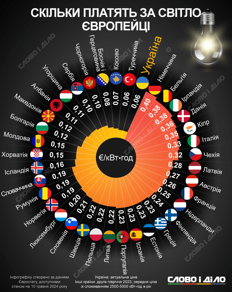 Як виявилося, найвищі ціни на електроенергію встановлені у Німеччині (0,40 євро за кВт-год), а також Бельгії та Ірландії (по 0,38 євро кВт-год). У Данії один кіловат коштує 0,36 євро, на Кіпрі – 0,35 євро, в Італії – 0,33 євро, у Чехії – 0,32 євро, у Латвії – 0,28 євро, в Австрії – 0,27 євро, Франції – 0,26 євро, Нідерландах – 0,25 євро, Фінляндії – 0,24. Мешканці Греції, Естонії, Іспанії, Литви та Португалії сплачували по 0,23 євро за одну кВт-год, у Польщі та Швеції – цей "тариф" складає 0,22 євро, у Словенії – 0,21 євро, у Люксембурзі – 0,20 євро.