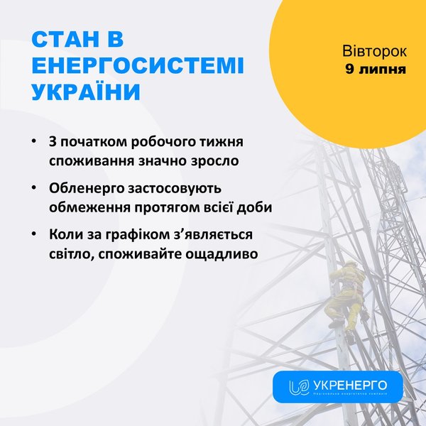 У вівторок, 9 липня, обленерго по всій країні застосовують обмеження споживання протягом всієї доби. До 14:00 застосовуватимуть 2 черги графіків погодинних відключень, а з посиленням спеки планується запровадити 3 або 4 черги, інформують в Укренерго.