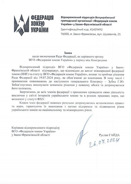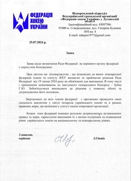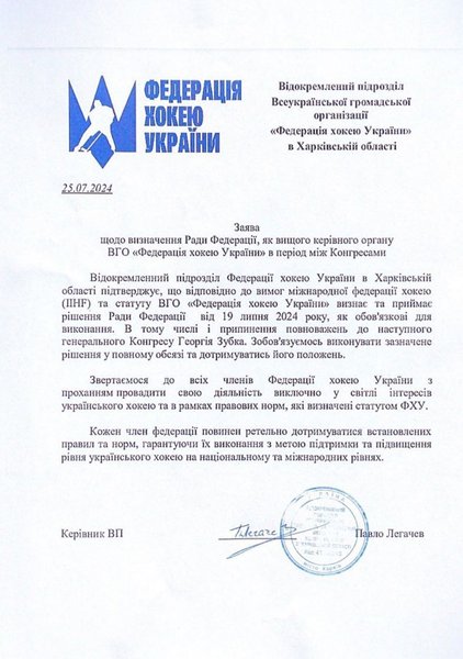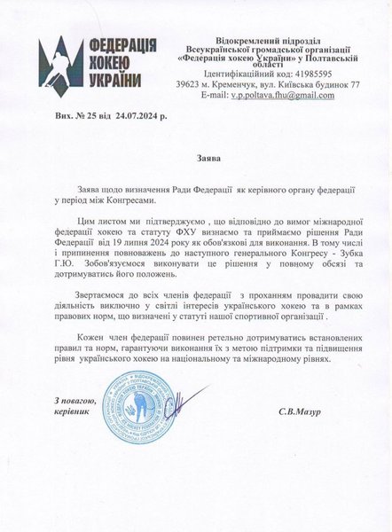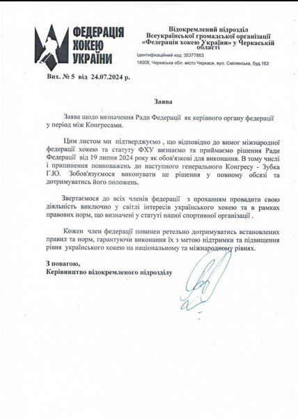 У вересні 2024 року відбудеться Генеральний Конгрес ФХУ, на якому мають обрати нового керівника. Тимчасово виконуючою обов’язки президента федерації призначили віцепрезидентку Олександру Слатвицьку. Члени Ради ФХУ повідомили керівні органи українського спорту про зміни в керівництві федерації, а також направили відповідний лист в Міжнародну федерацію хокею (IIHF), повідомляють журналісти.